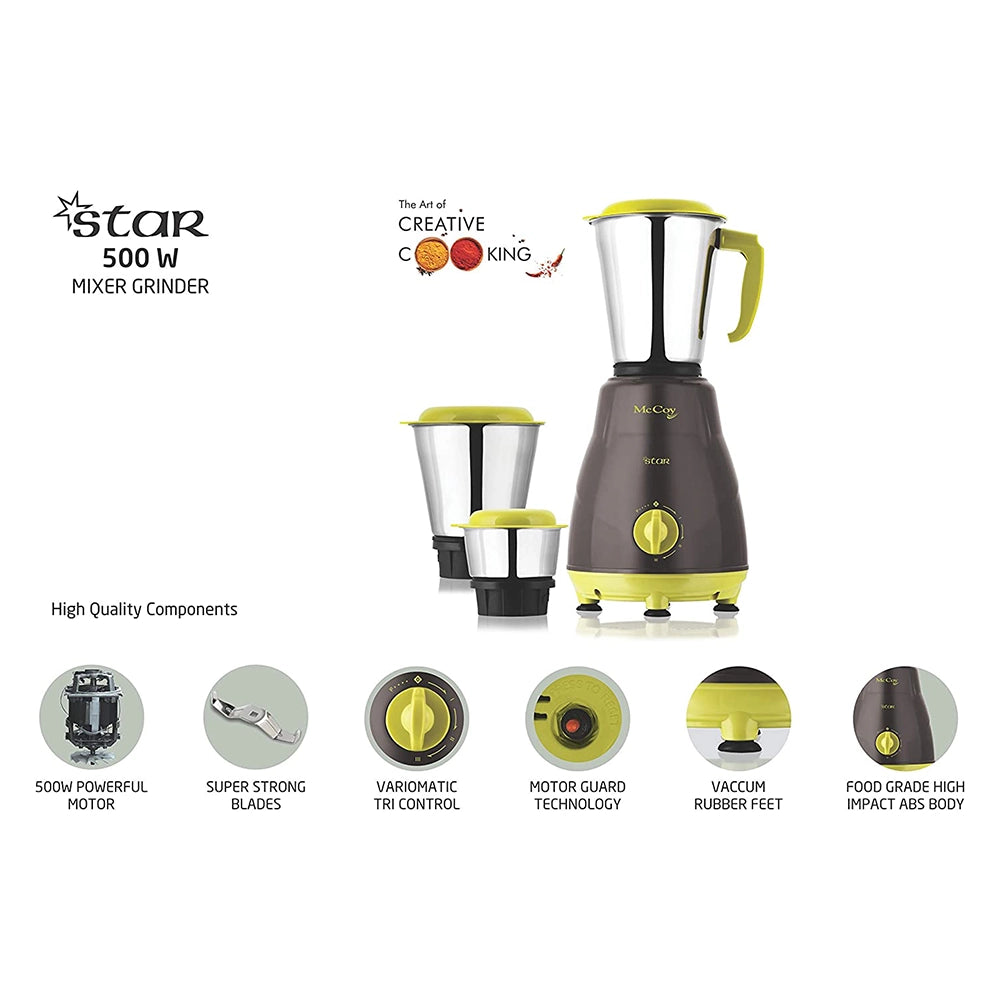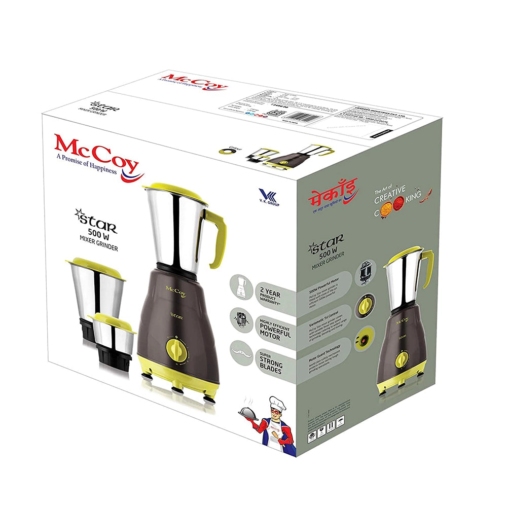 - Experience culinary excellence with the McCoy Star 500-Watt Mixer Grinder. It's not just an appliance; it's your trusted culinary companion that empowers you to create mouth-watering dishes with ease. Elevate your cooking game and enjoy the convenience of efficient food preparation.